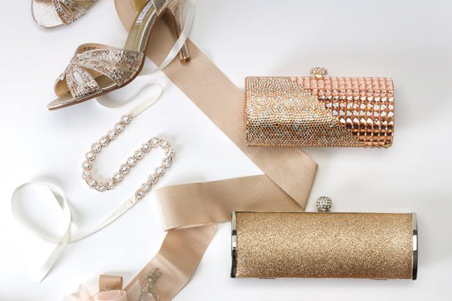 Belt: David Tutera, Claire’s Fashions, Wilmington, $313. Headband: Paulina Couture rose gold crystal, Brides 2 Be By Hope Mitchell, Rehoboth Beach, $165. Shoes: Touch Ups by Benjamin Walk (Poise), Claire’s Fashions, $89. Clutches, from top: Custom-made purse by Bedazzled Boutique, Bedazzled Boutique, Newtown Square, $275. Coloriffics, Occasions Boutique, Malvern, $50. Nite Bags, Claire’s Fashions, $59.