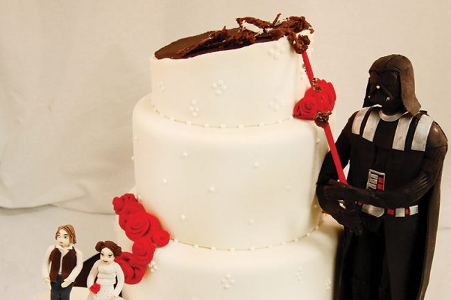 Although the vast majority of groom’s cakes are still chocolate, they have become more about appearance than taste in recent years. Eileen Gray, owner of Cake Art Studio in Paoli, eats, sleeps and breathes pastry. In the 20 years Gray has been a pastry chef, she’s decorated her fair share of grooms’ cakes—ranging from a black, white and red Beatles cake to a Star Wars cake with Darth Vader at its side. The design possibilities are endless and typically come with a gentler price tag than the wedding cake itself.