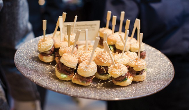 Pros: It’s creative. “Typically food stations are for out-of-the-box offerings,” Wheeler agrees. Think mashed white potato and sweet potato bars or a sushi bar. Berkowitz has offered macaroni-and-cheese stations with different toppings, Thai noodle salad, served in takeout boxes with chopsticks, and an elaborate antipasti display. Action stations add a dynamic flair. Picture a chef making the sushi or whipping up a stir-fry in a wok. “That’s the direction buffets are taking now,” Pantaleone says. “It’s a newer, more fun approach.” Stations can cost less than a sit-down dinner or a buffet because guests only have a few bites at each. However, the pressure to be creative can boost the price. Sushi doesn’t come cheap.