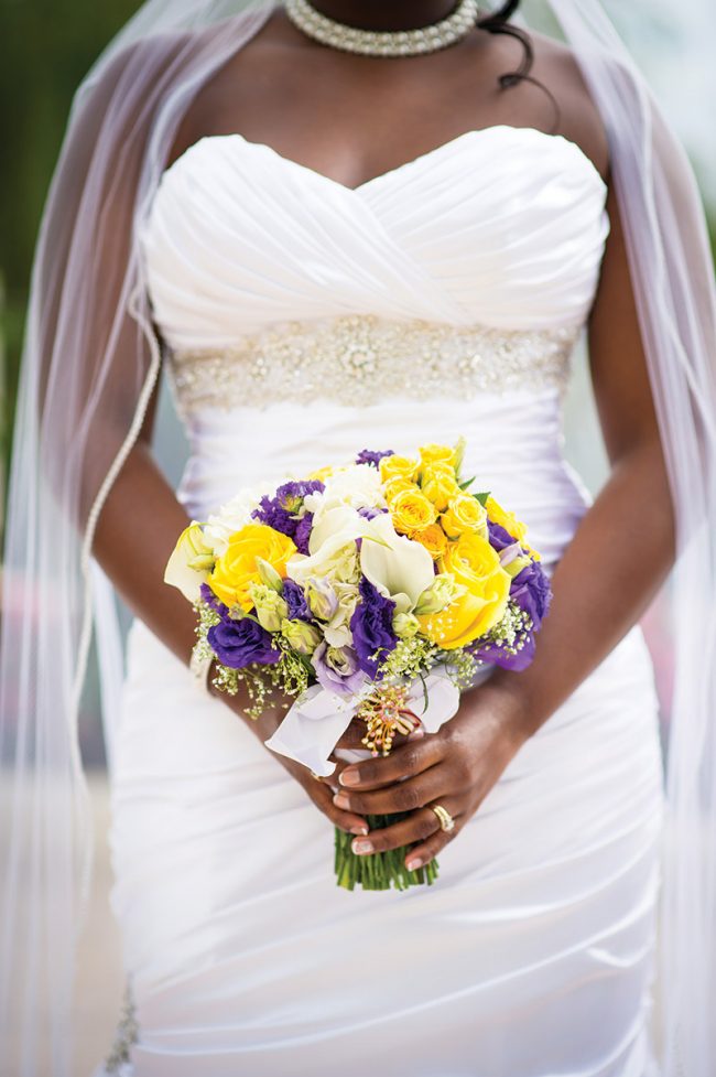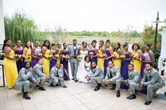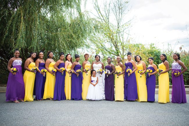 The big day: The big day: (Sept 26, 2015) Chrissy says the day of her wedding was amazing and the weather was perfect. However, there were a few bumps in the road that were out of the couple’s control. “We got married the weekend the Pope was in town. My dad’s mom was arriving from New York but her driver got lost from all the road closures and missed the ceremony,” she says. There were a total of 26—yes 26—people in the bridal party. “I separated the 13 bridesmaids in two—the girls in purple were family while the others in yellow were very close friends,” she says.